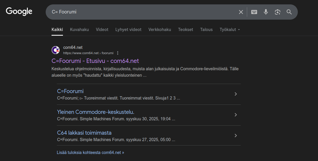 Täällä haku C= Foorumi näkyy Googlen hakutulosten kärjessä.